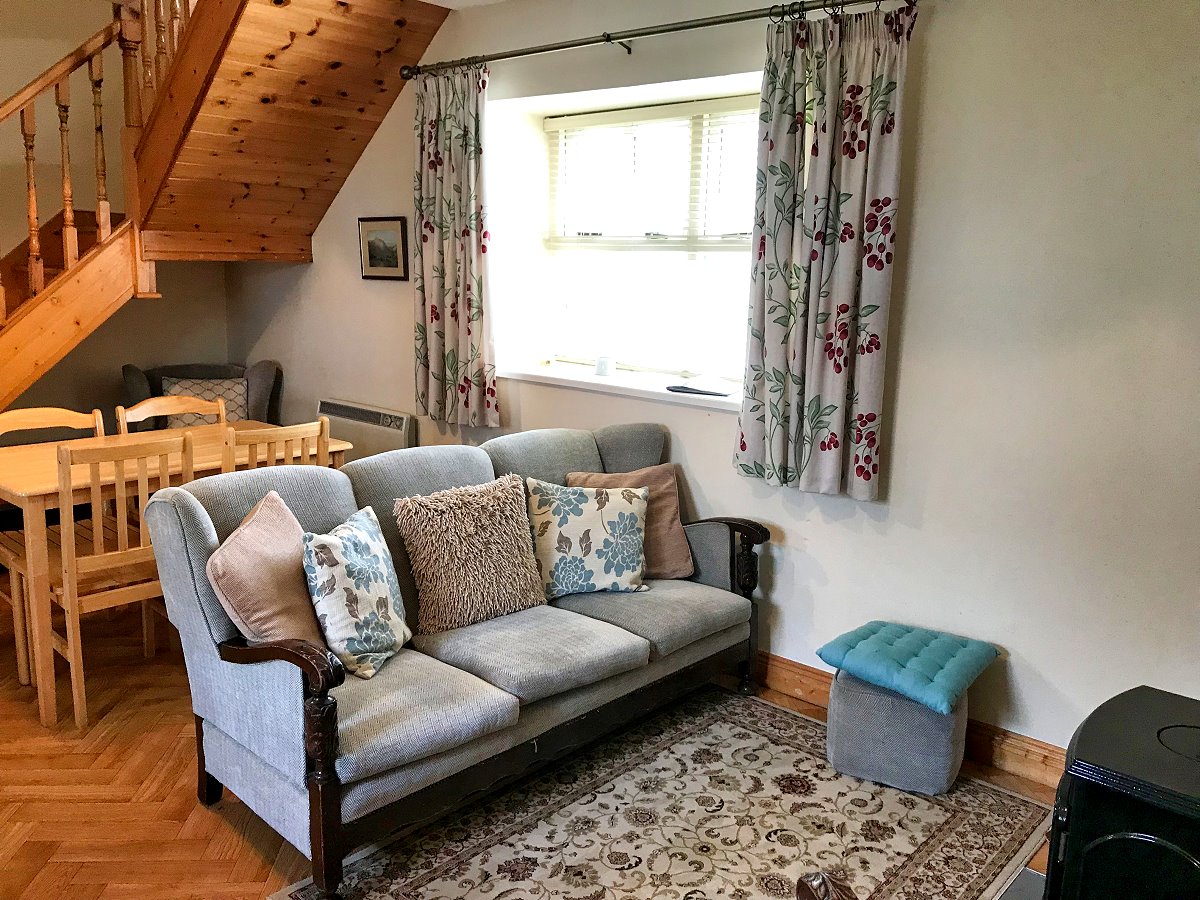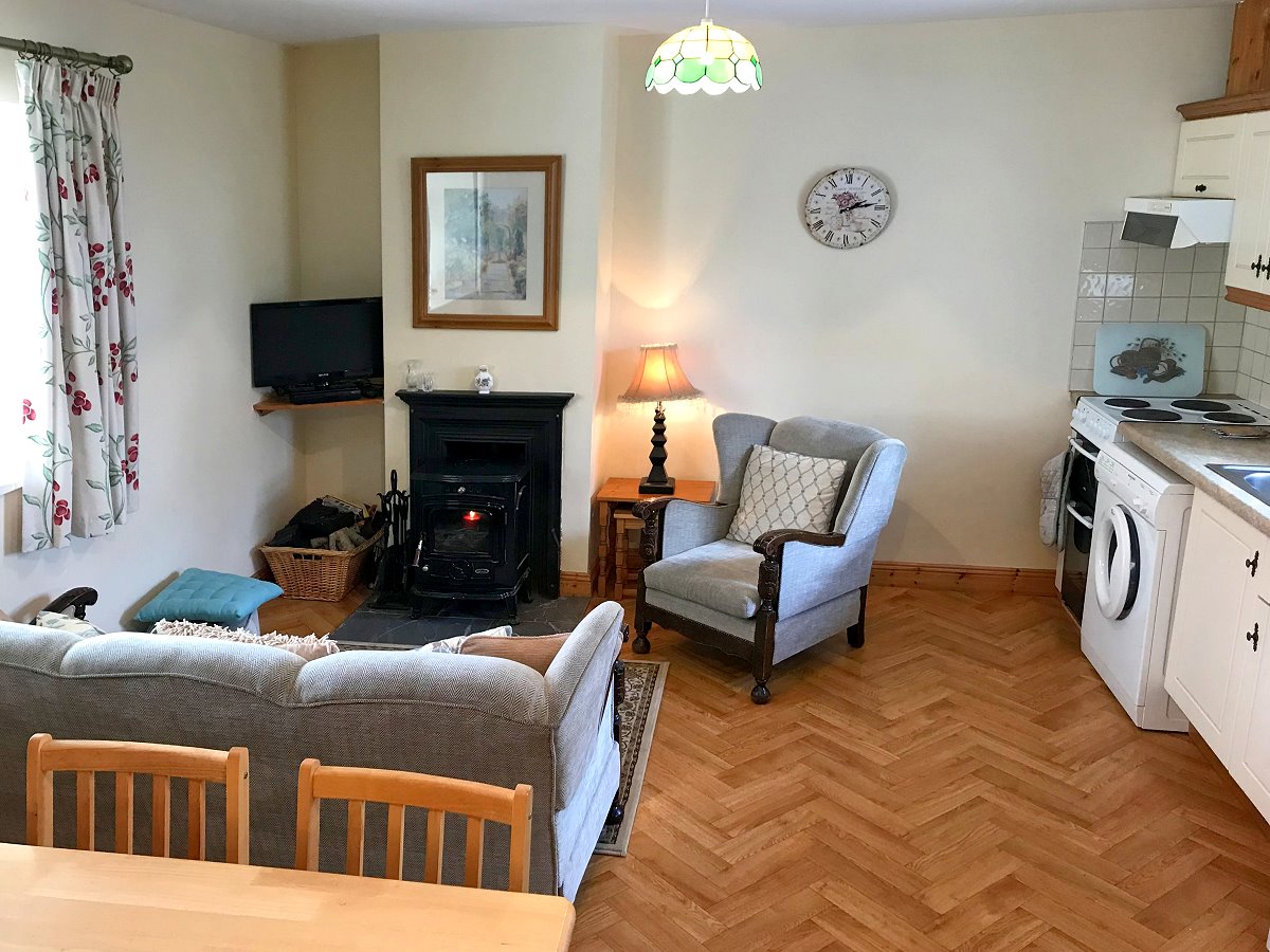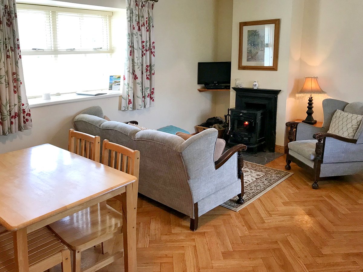 Das Erdgeschoss ist offen gestaltet mit Küche, Wohnzimmer und Essbereich. Die gemütliche Sitzecke bietet einen Kaminofen und TV.