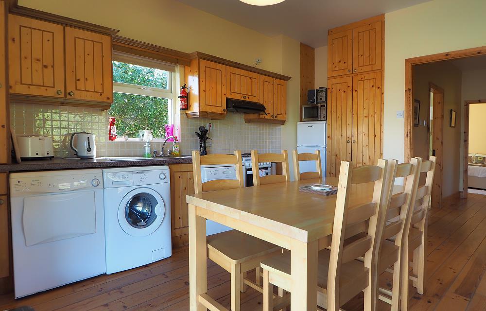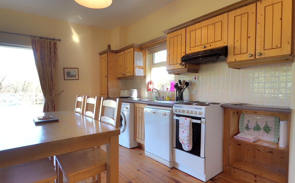 Die Küche ist komplett ausgestattet mit Elektroherd, Mikrowelle, Kühl / Gefrierkombination, Waschmaschine, Wäschetrockner und Geschirrspüler. Ein Hochstuhl ist vorhanden, wenn nötig.