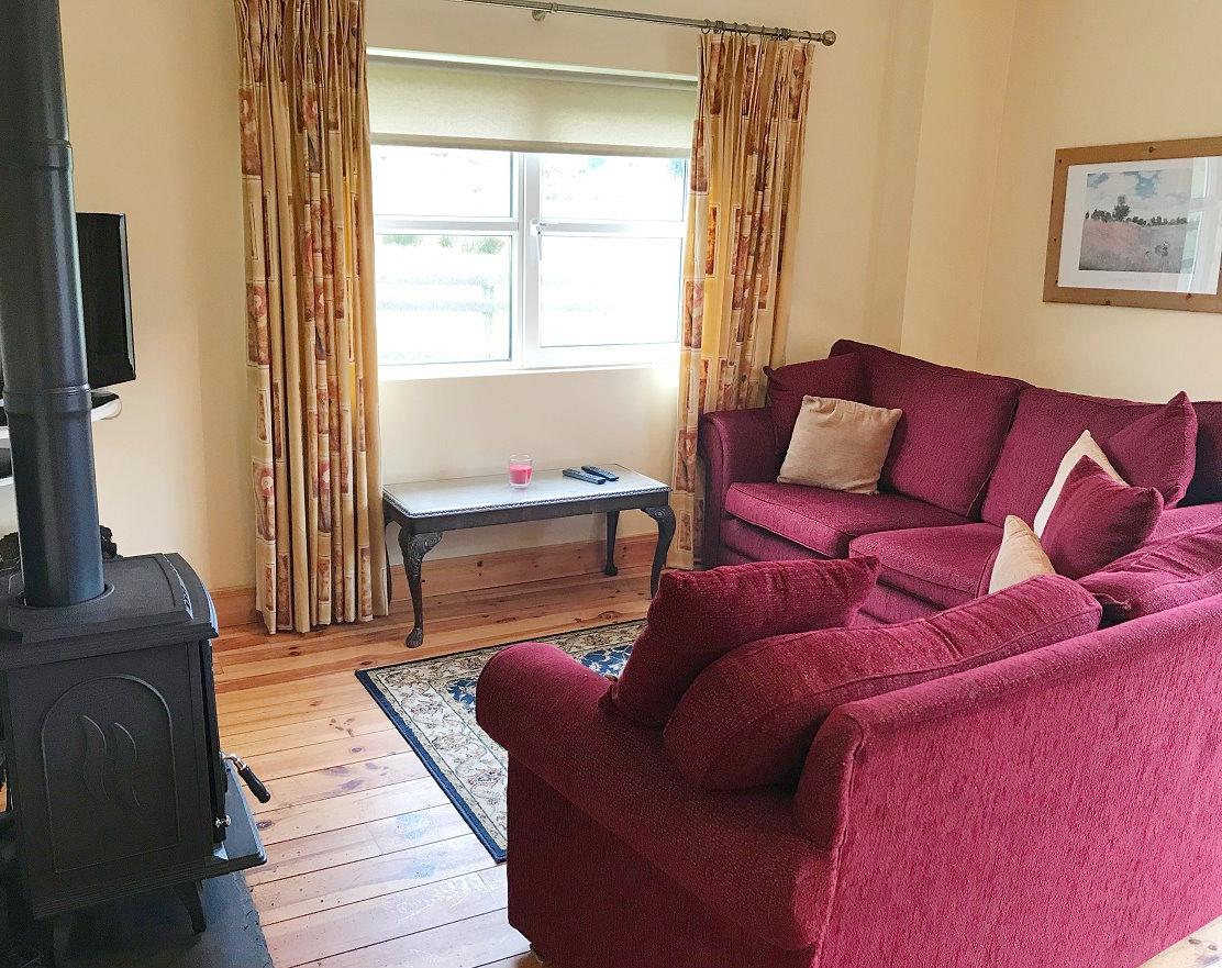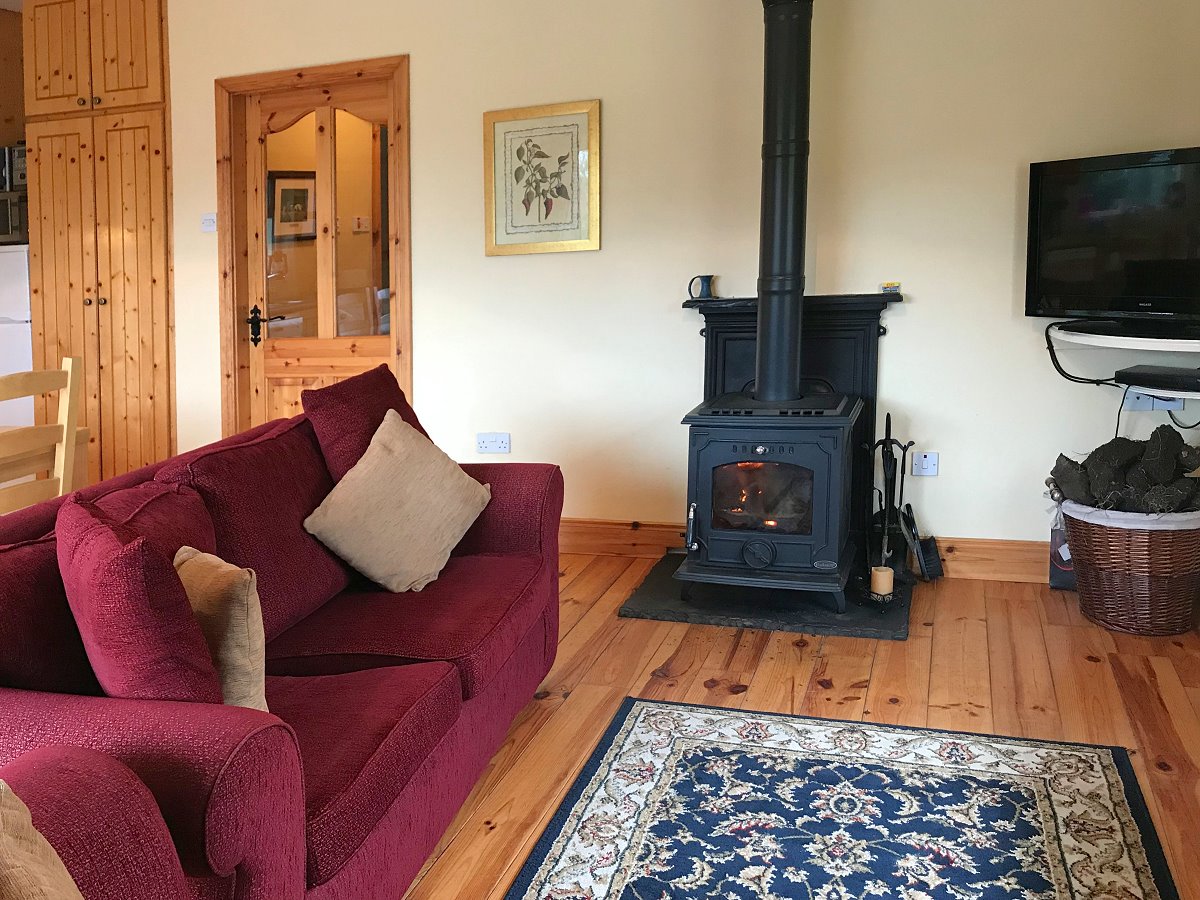 The ground floor is open plan with a kitchen, living room with solid fuel stove, a dining area and a TV.